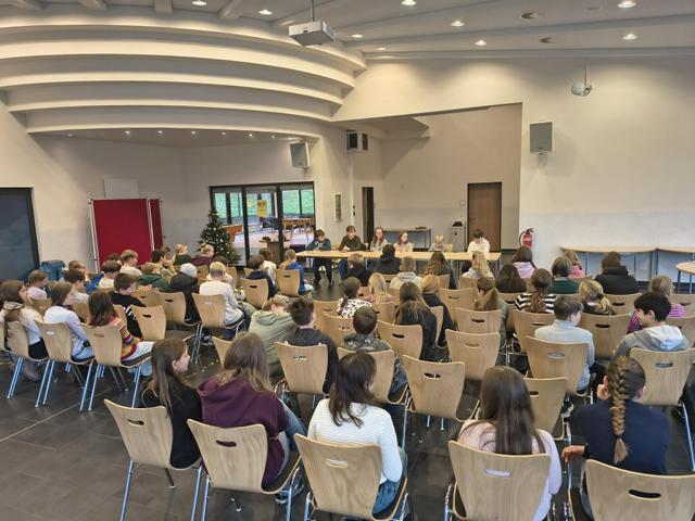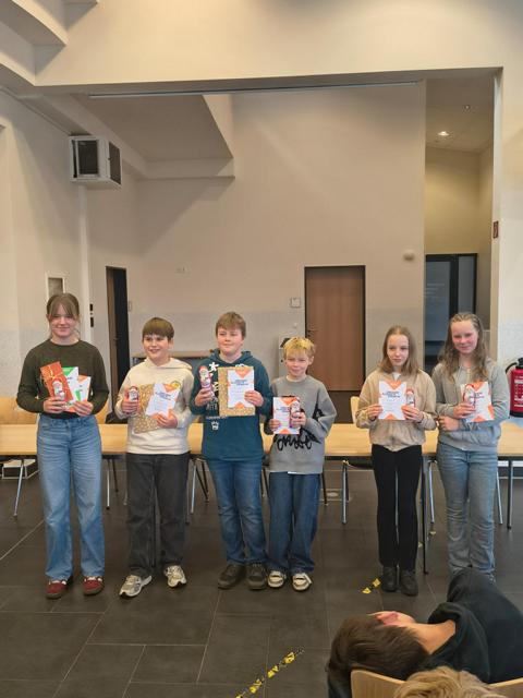 Anfang Dezember folgte dann der mit Spannung erwartete Vorlesewettbewerb der 6. Klassen. In der Mensa des Schulzentrums traten die jeweiligen Klassensiegerinnen und Klassensieger gegeneinander an und stellten ihr Vorlesetalent eindrucksvoll unter Beweis. Nach einer äußerst knappen Entscheidung durfte sich schließlich Ida Finke über den Titel der Schulsiegerin freuen.